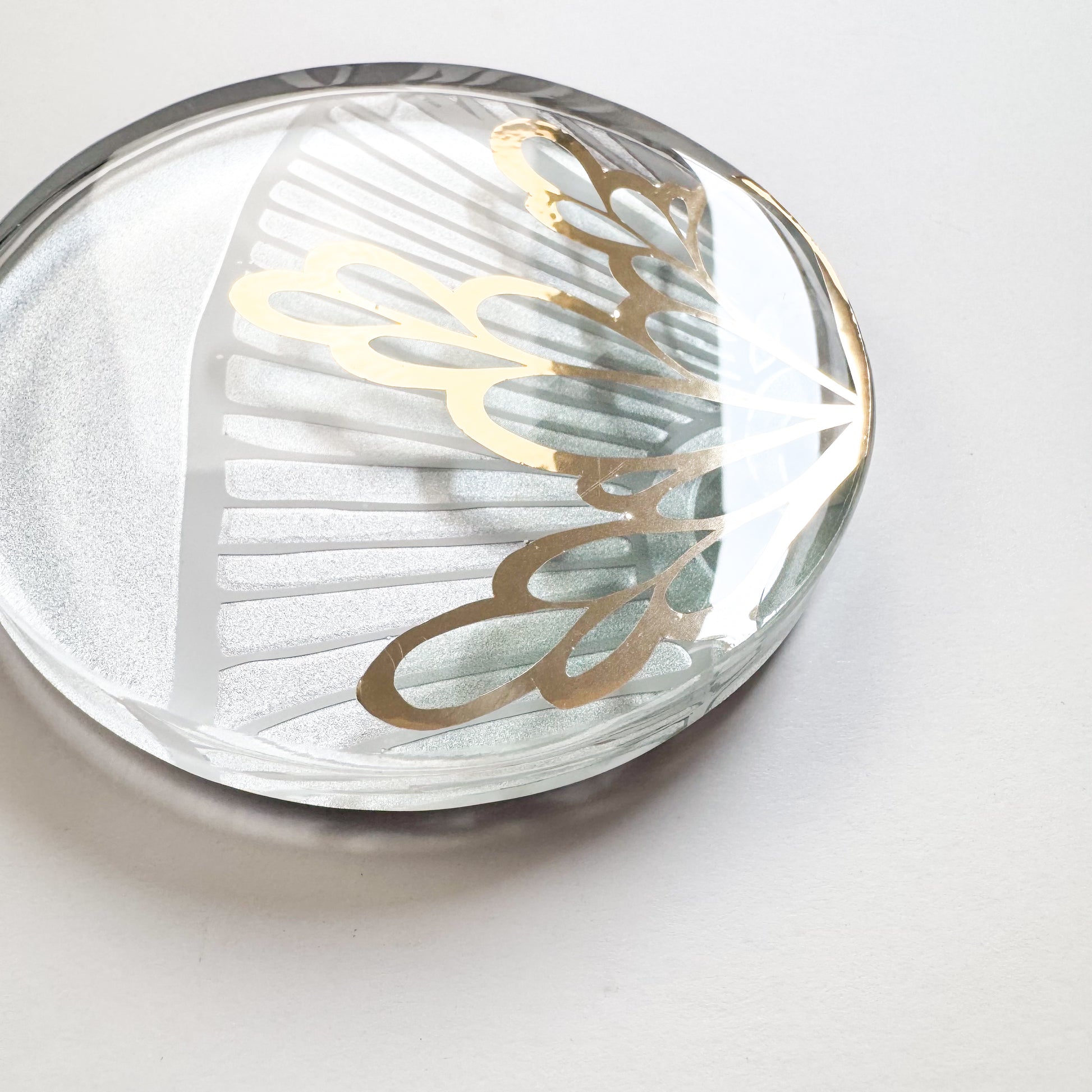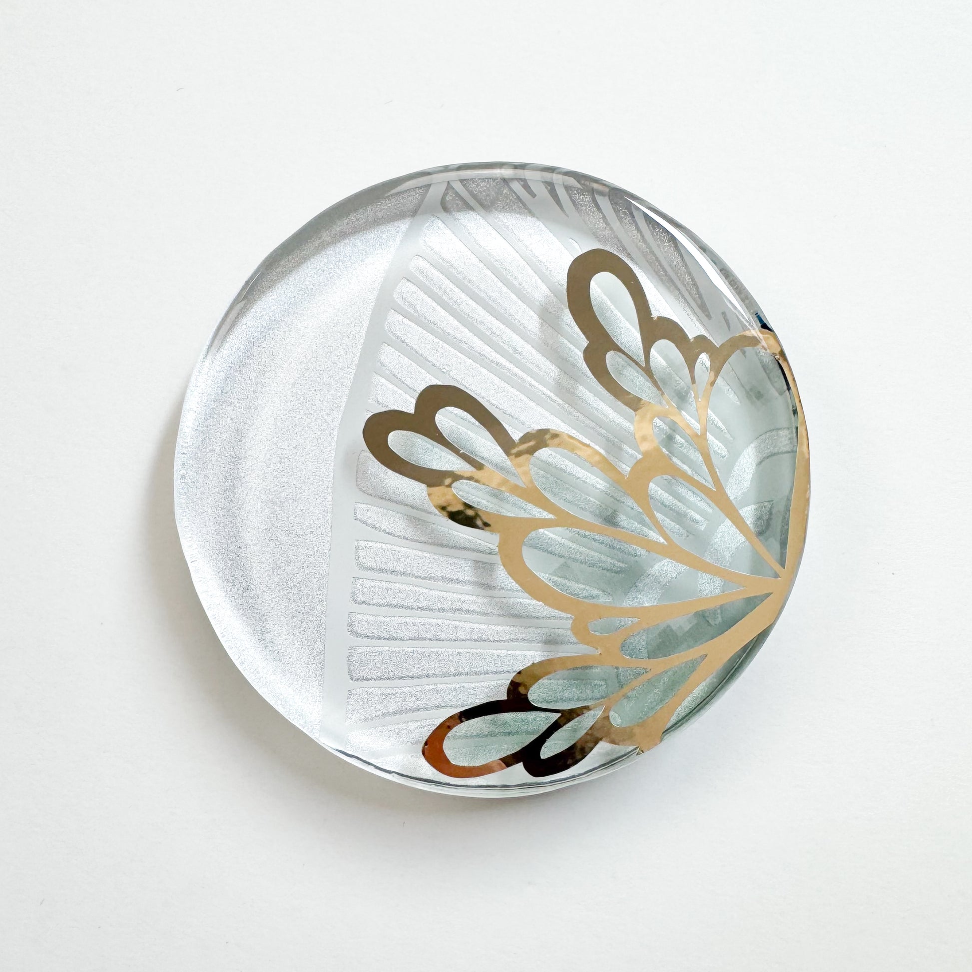 4"d - A circular clear plexiglass panel layered with a cut-out watercolour painting and gold vinyl, set against cut out while and reflective vinyl on the reverse. The surface is sealed in glossy resin, creating depth and an interplay of light within the composition. Ready to hang with D-rings affixed to the back.