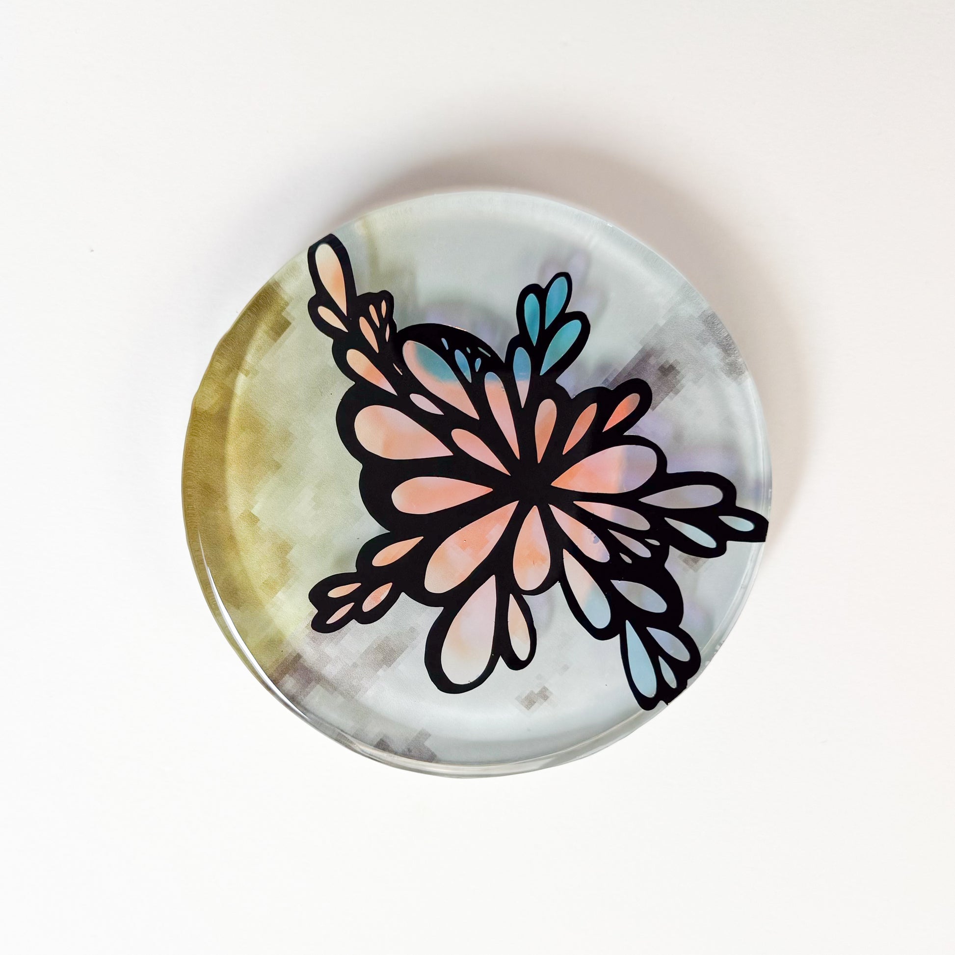 4.5"d - A circular clear plexiglass panel layered with a cut-out drawing in black and dichroic vinyl, set against a print of a watercolour painting on the reverse. The surface is sealed in glossy resin, creating depth and light interplay within the composition. Ready to hang with D-rings affixed to the back.