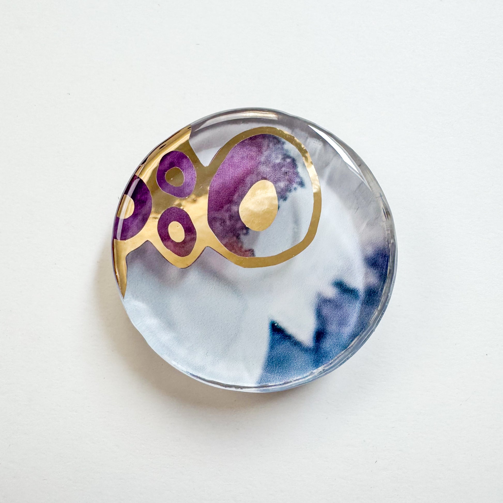 2.5"d - A circular clear plexiglass panel layered with a cut-out gold vinyl, set against a print of a watercolour painting on the reverse. The surface is sealed in glossy resin, creating depth and an interplay of light within the composition. Ready to hang with D-rings affixed to the back.