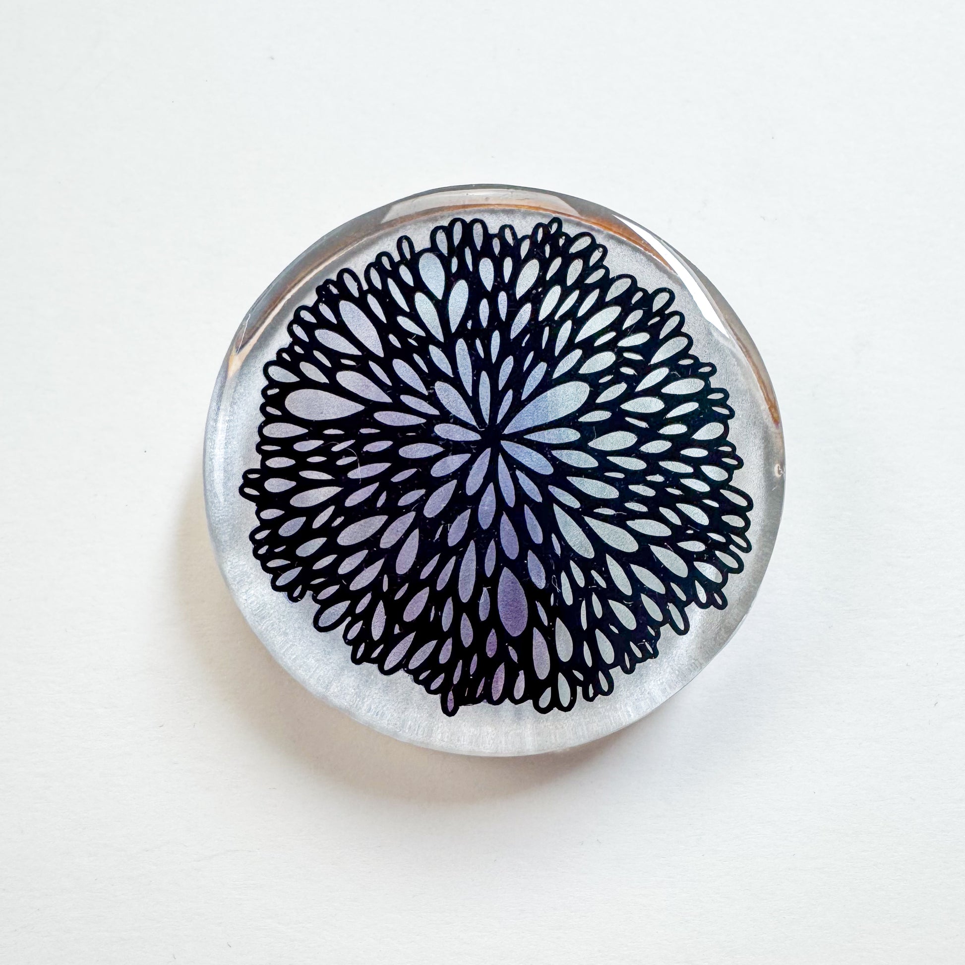 2.5"d - A circular clear plexiglass panel layered with a cut-out watercolour painting and black vinyl, set against reflective vinyl on the reverse. The surface is sealed in glossy resin, creating depth and an interplay of light within the composition. Ready to hang with D-rings affixed to the back.
