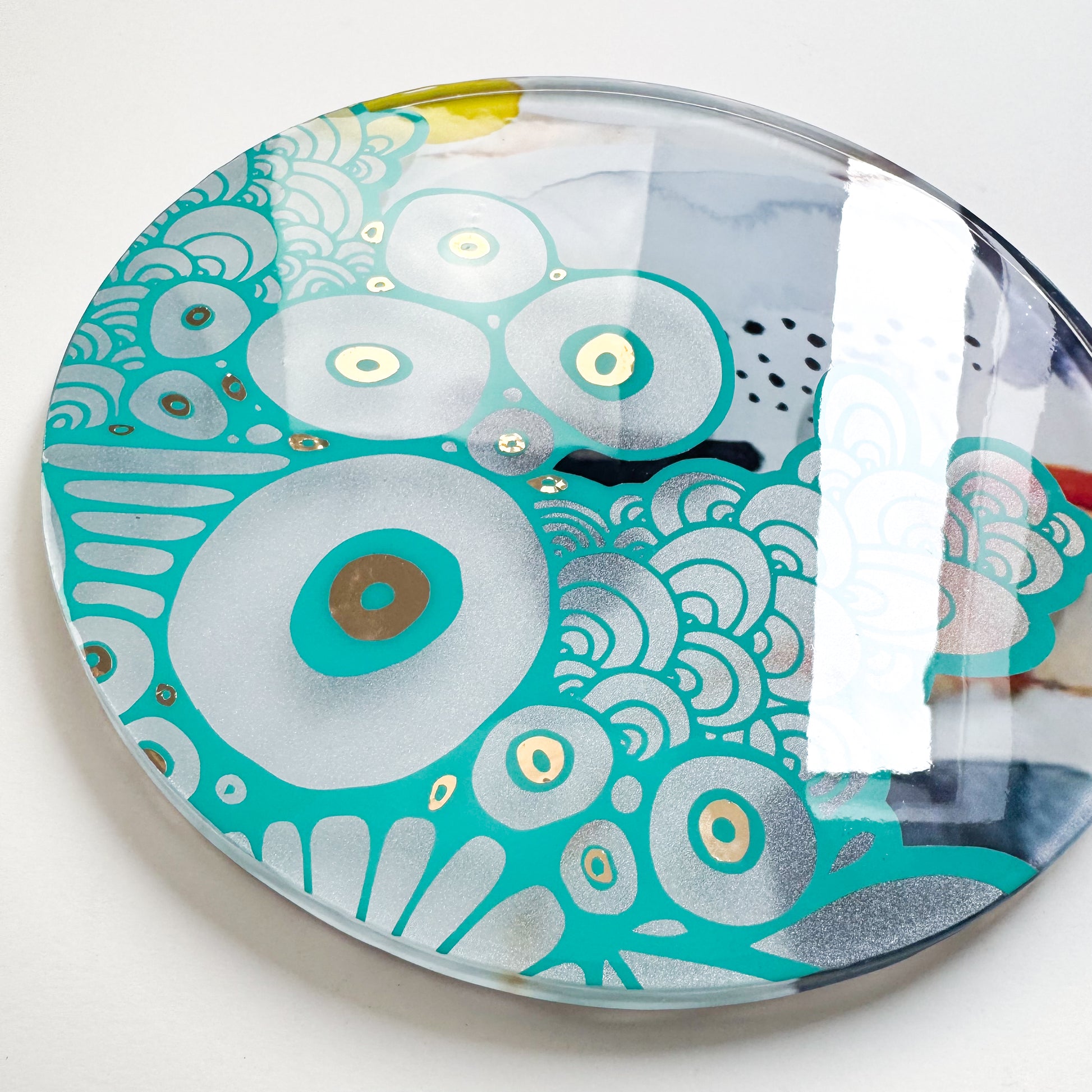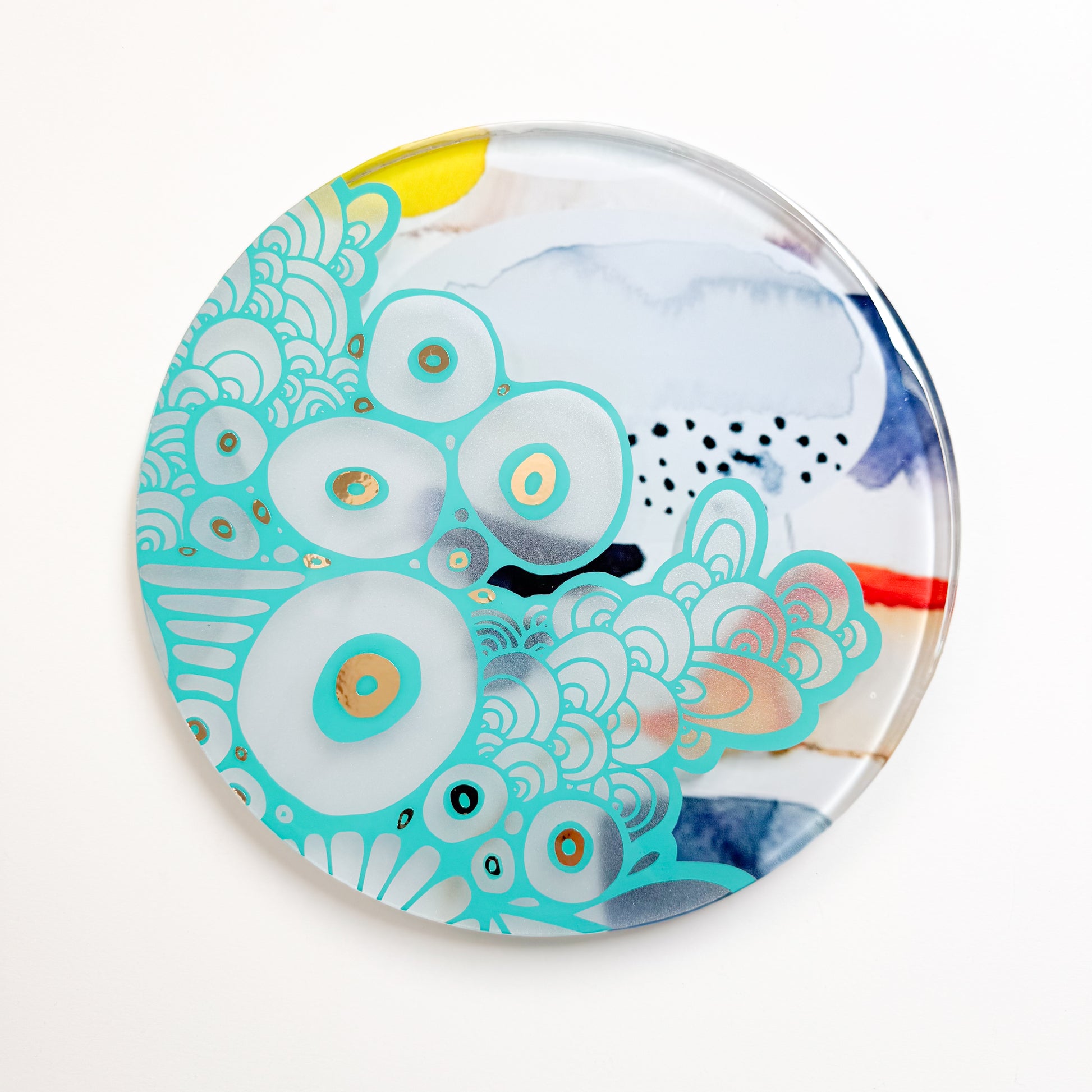 10.5"d - A circular clear plexiglass panel layered with a cut-out teal, gold and frosted vinyl, set against a print of a watercolour painting on the reverse. The surface is sealed in glossy resin, creating depth and an interplay of light within the composition. Ready to hang with D-rings affixed to the back.