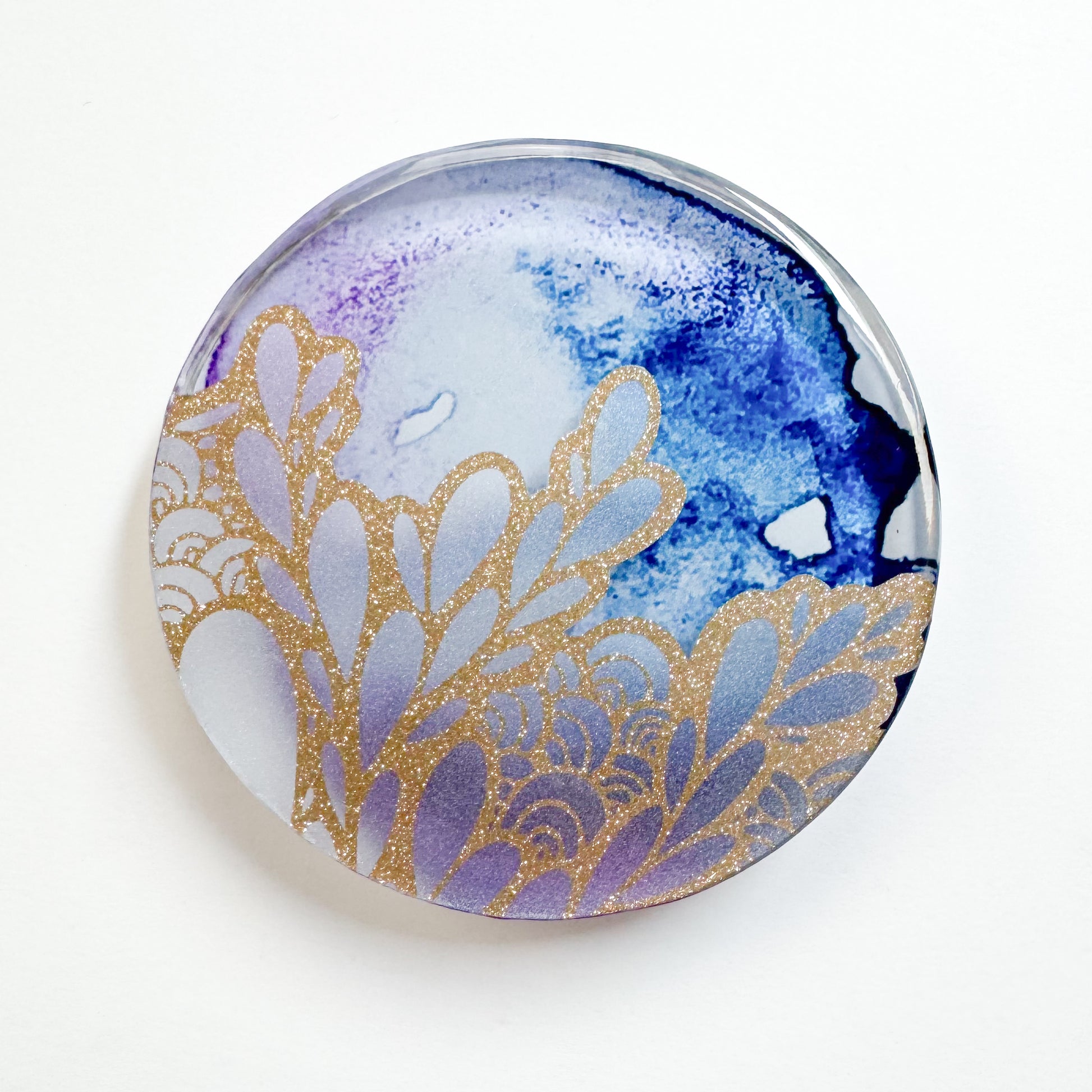 4.25"d - A circular clear plexiglass panel layered with a cut-out sparkle gold and frosted vinyl, set against a watercolour paintings on the reverse. The surface is sealed in glossy resin, creating depth and an interplay of light within the composition. Ready to hang with D-rings affixed to the back.