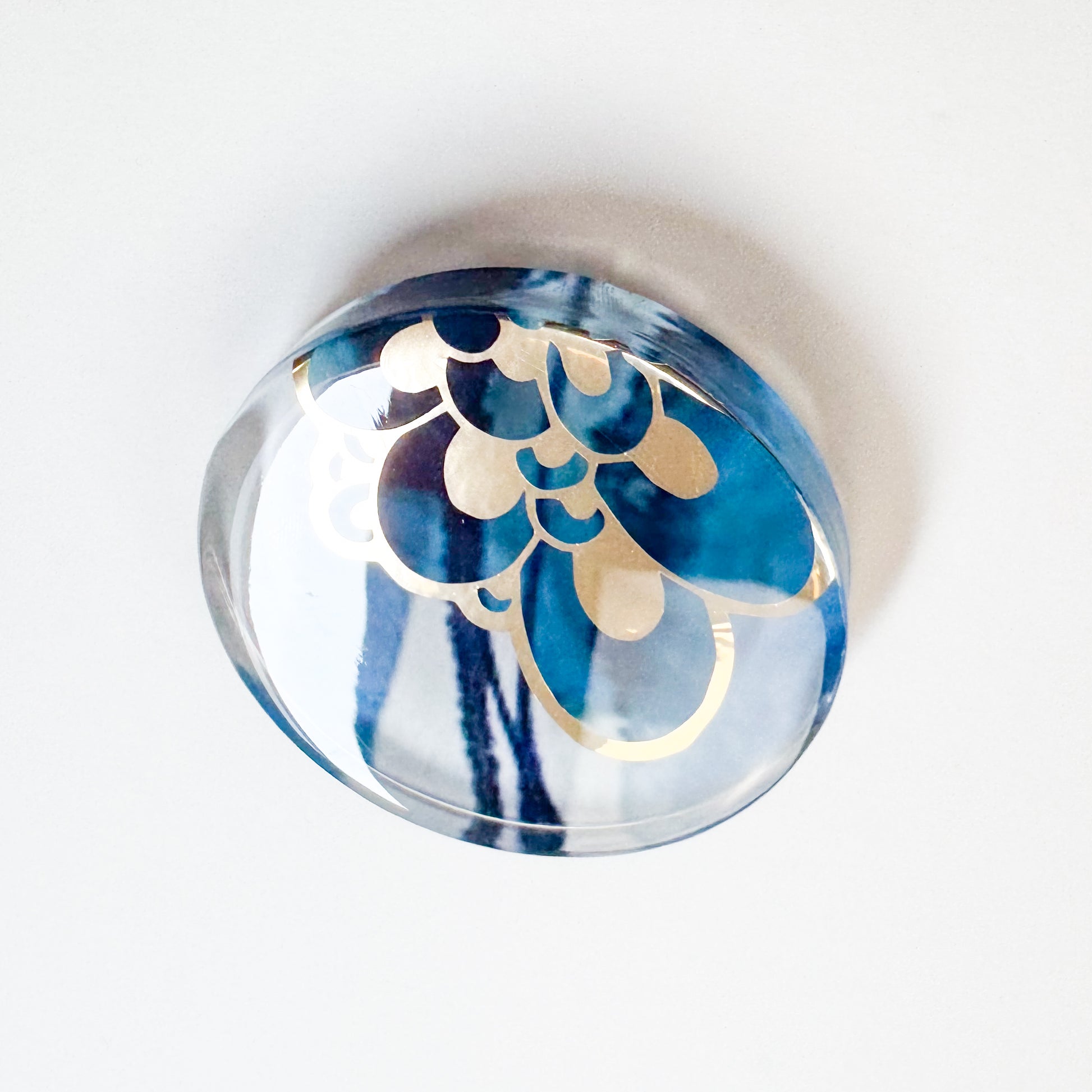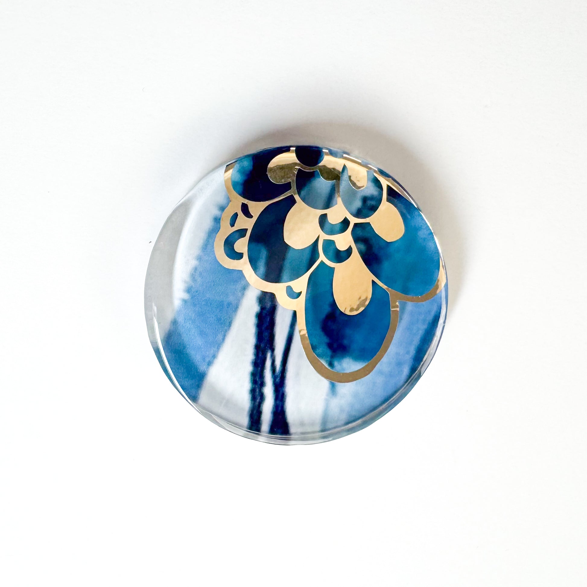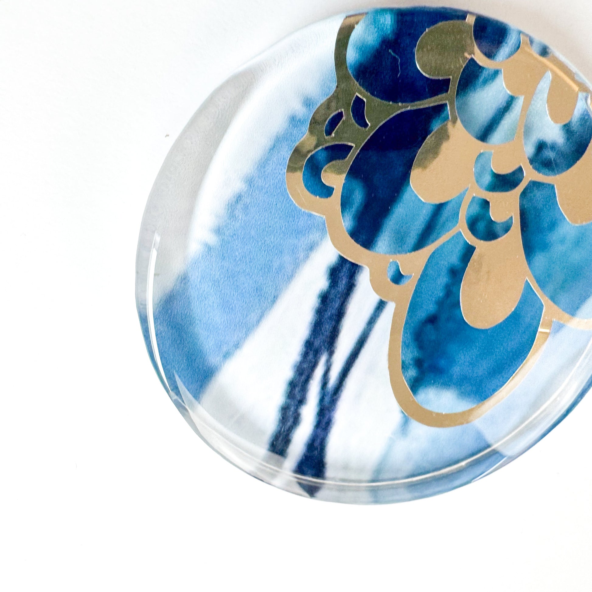3.25"d - A circular clear plexiglass panel layered with a cut-out watercolour painting and gold vinyl, set against a print of a watercolour painting on the reverse. The surface is sealed in glossy resin, creating depth and an interplay of light within the composition. Ready to hang with D-rings affixed to the back.