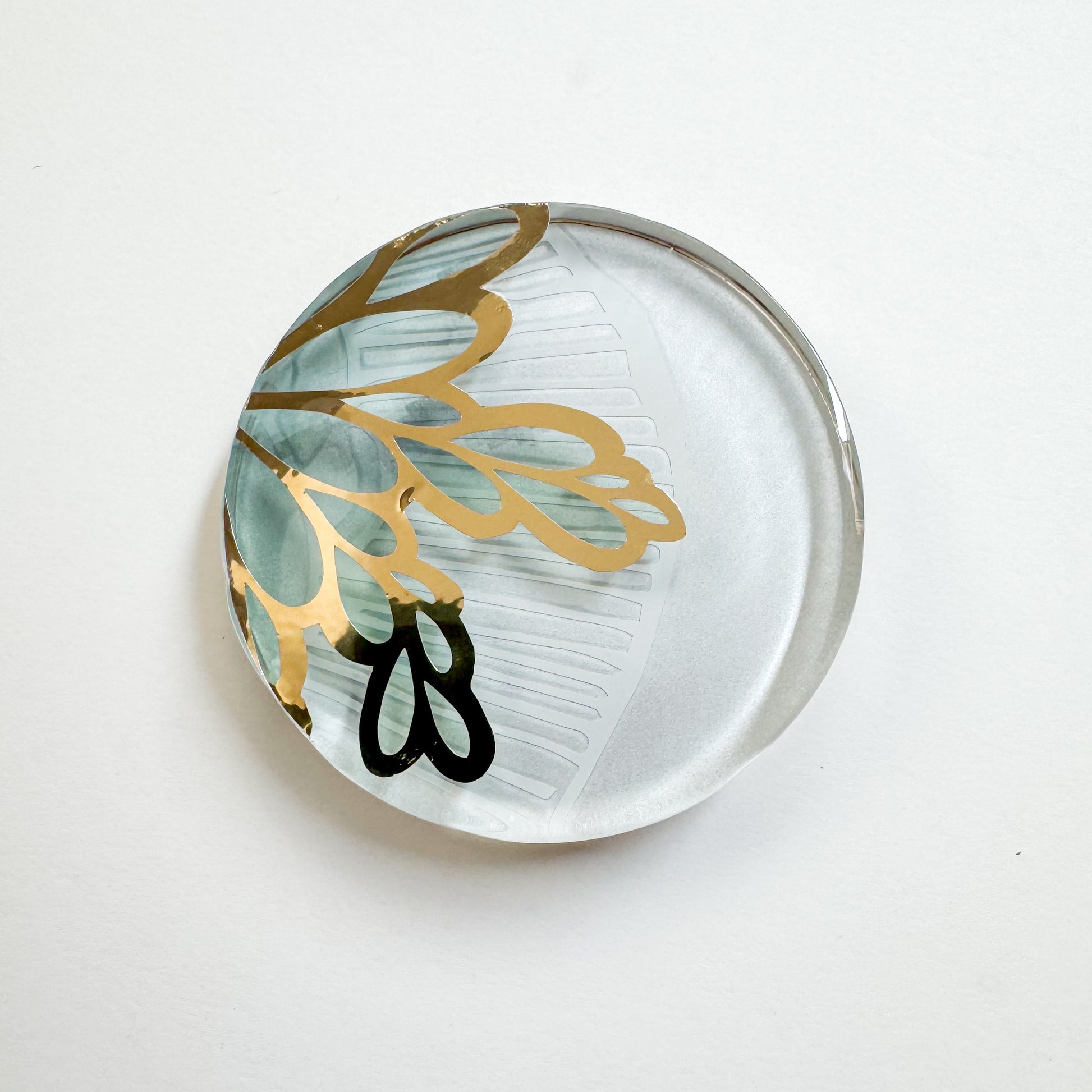3.5"d - A circular clear plexiglass panel layered with a cut-out watercolour painting and gold vinyl, set against a print of a watercolour painting on the reverse. The surface is sealed in glossy resin, creating depth and an interplay of light within the composition. Ready to hang with D-rings affixed to the back.