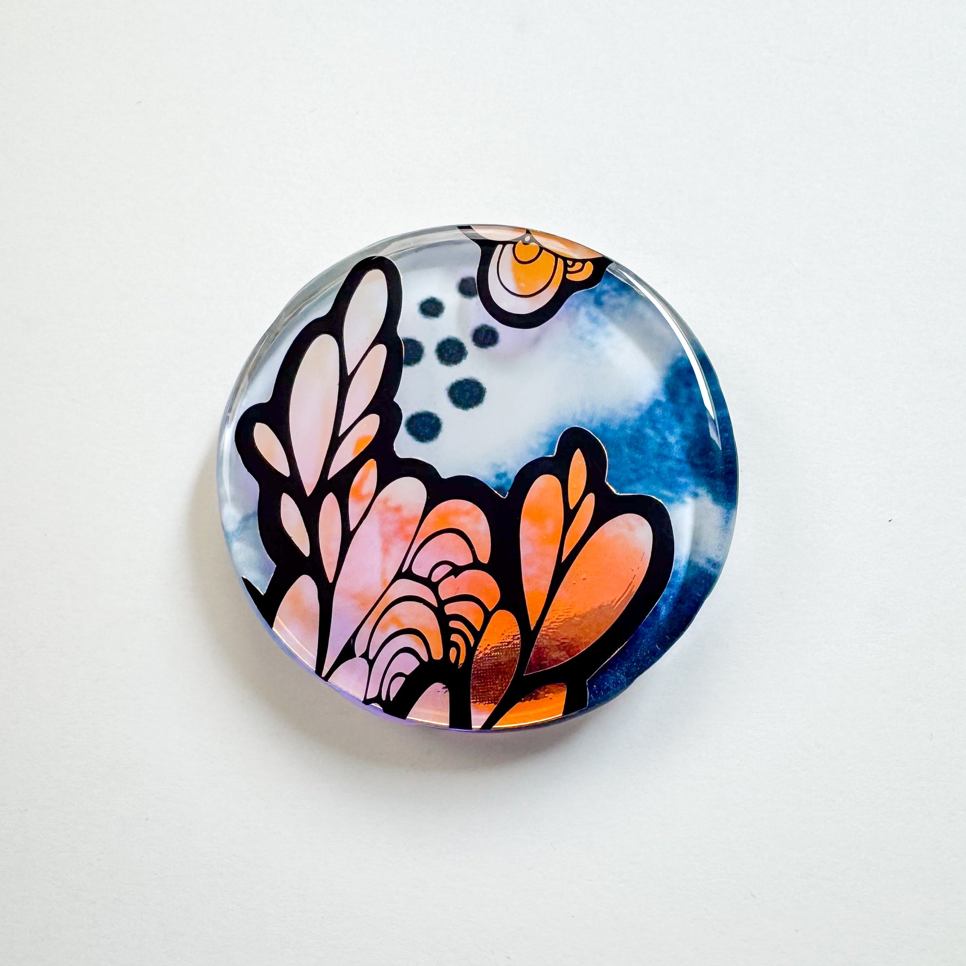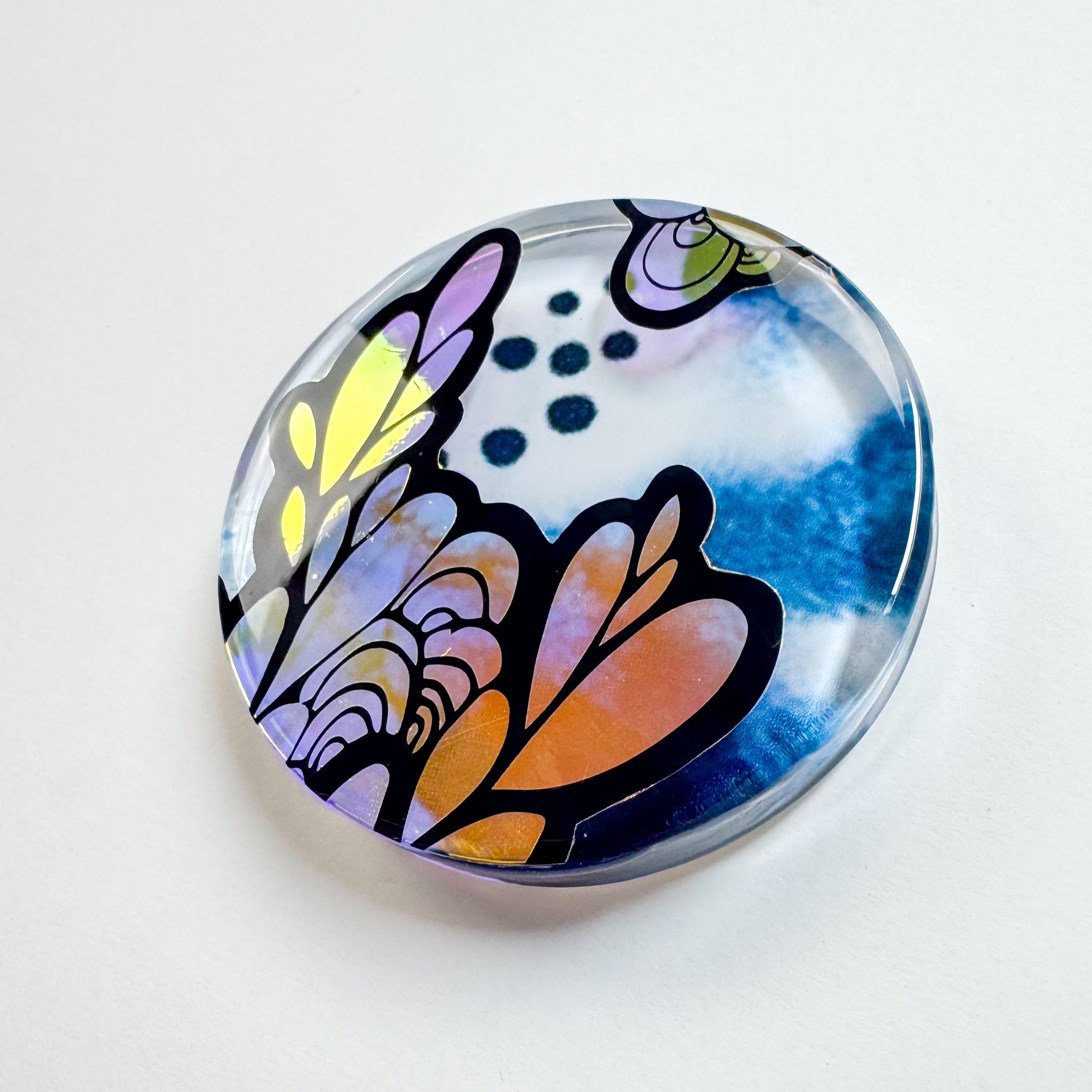 3.75"d - A circular clear plexiglass panel layered with a cut-out black and dichroic vinyl, set against a print of a watercolour painting on the reverse. The surface is sealed in glossy resin, creating depth and an interplay of light within the composition. Ready to hang with D-rings affixed to the back.