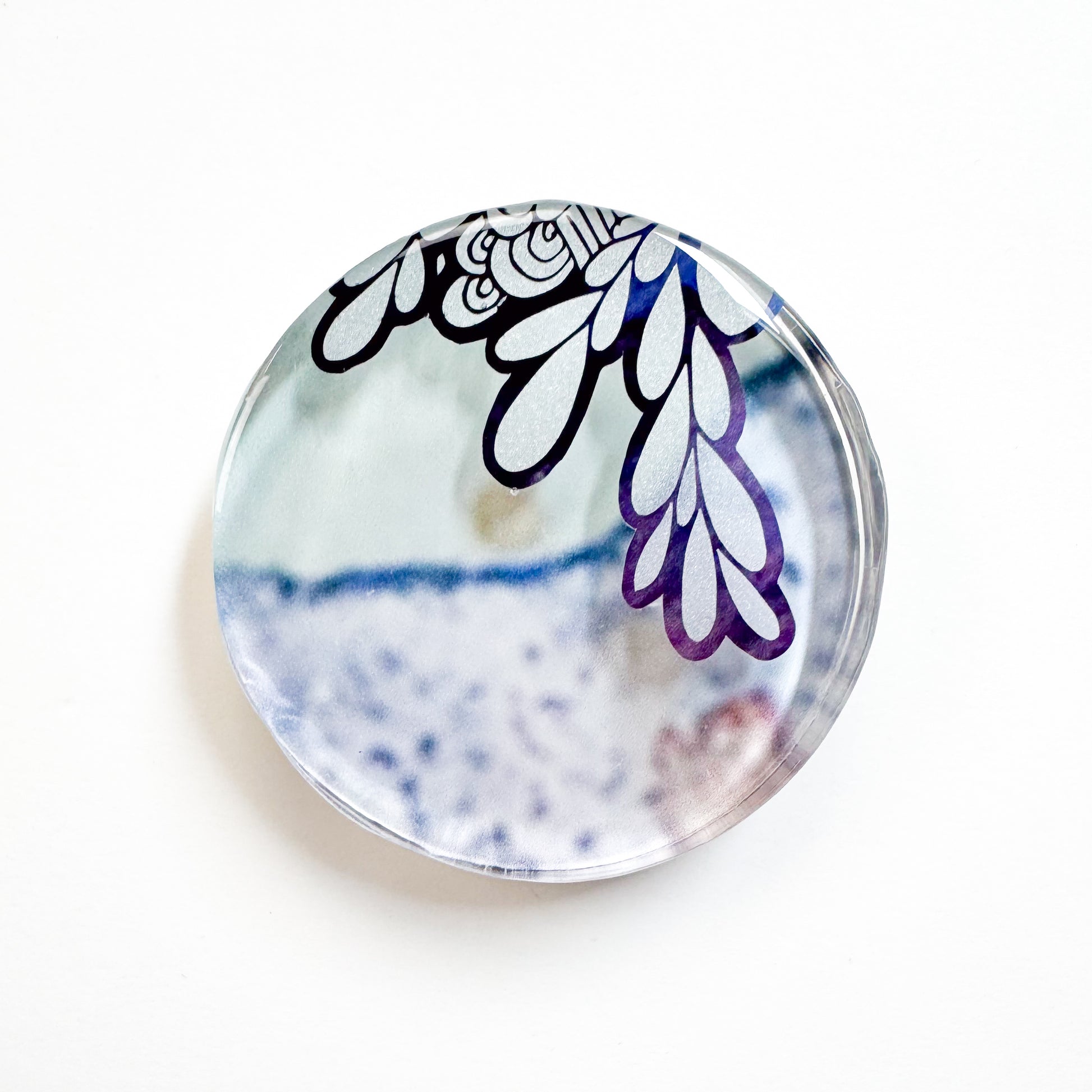 3"d - A circular clear plexiglass panel layered with a cut-out gold and frosted vinyl, set against a print of a watercolour painting on the reverse. The surface is sealed in glossy resin, creating depth and an interplay of light within the composition. Ready to hang with D-rings affixed to the back.