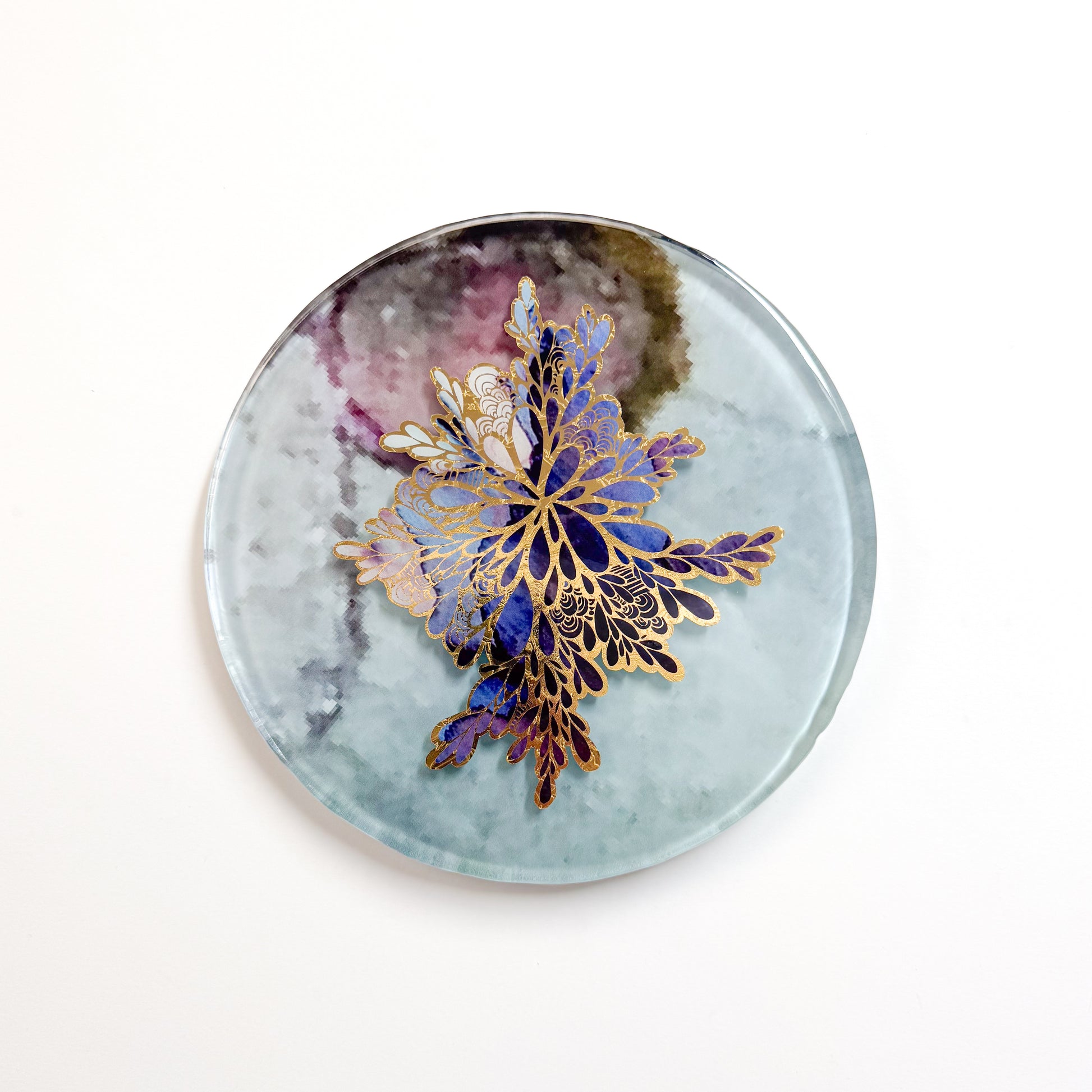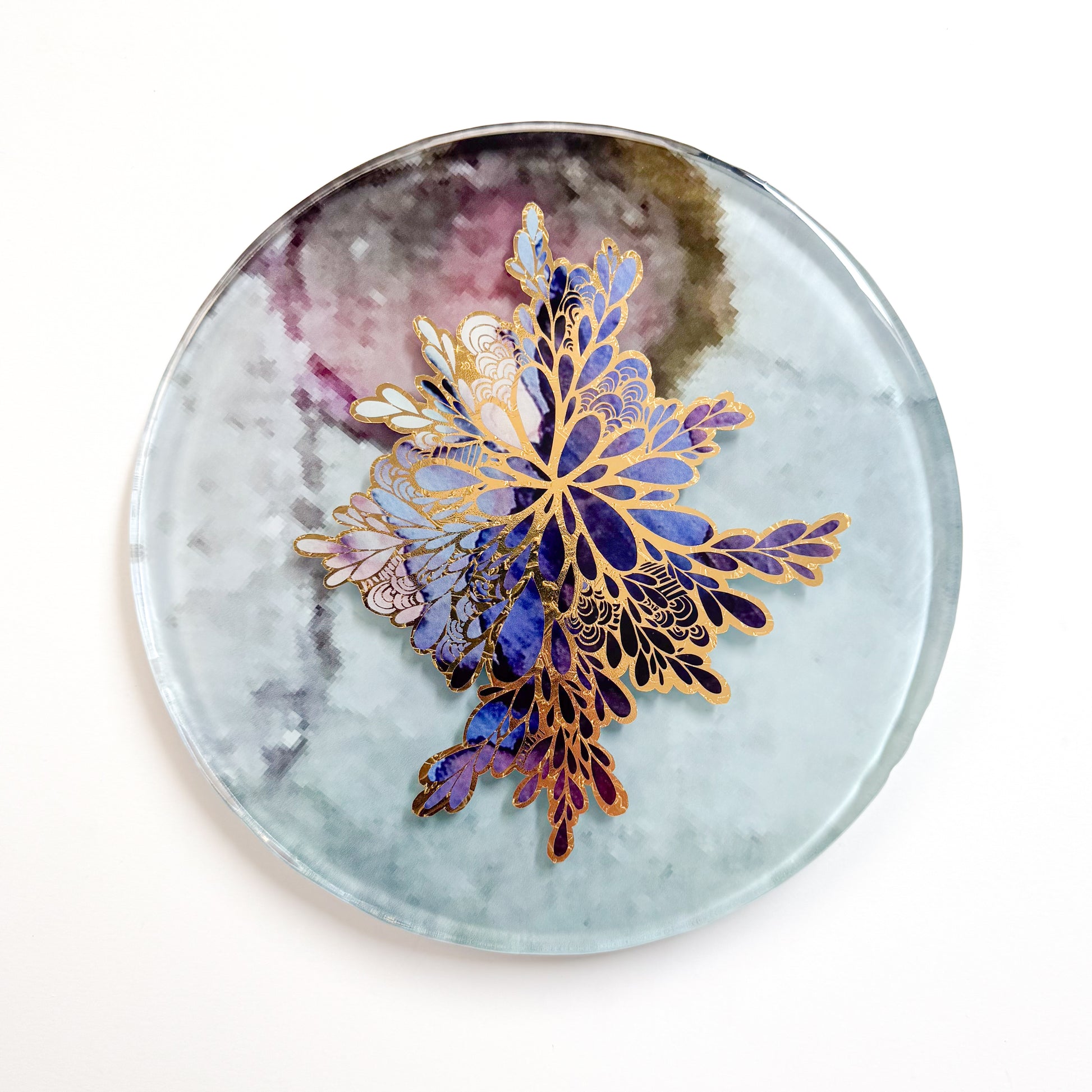 9.25"d - A circular clear plexiglass panel layered with a cut-out watercolour painting and antique gold vinyl, set against a print of a watercolour painting on the reverse. The surface is sealed in glossy resin, creating depth and an interplay of light within the composition. Ready to hang with D-rings affixed to the back.