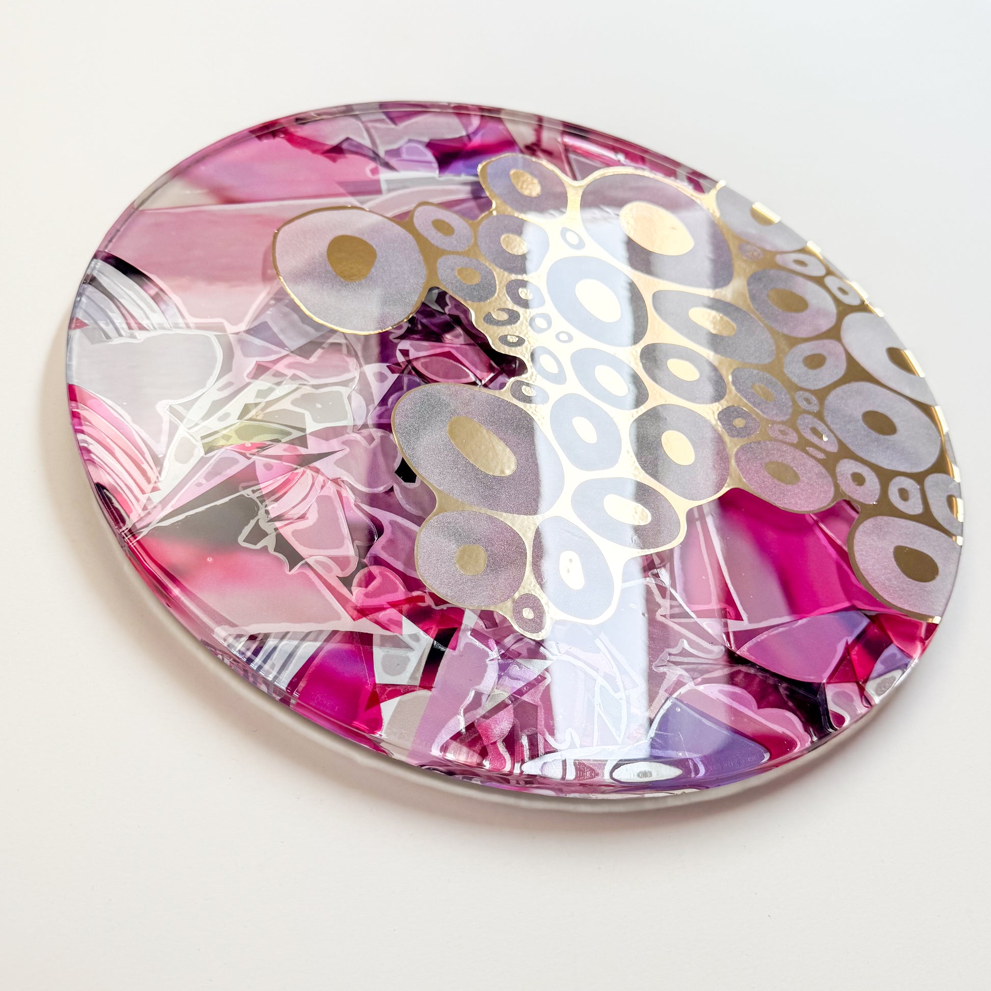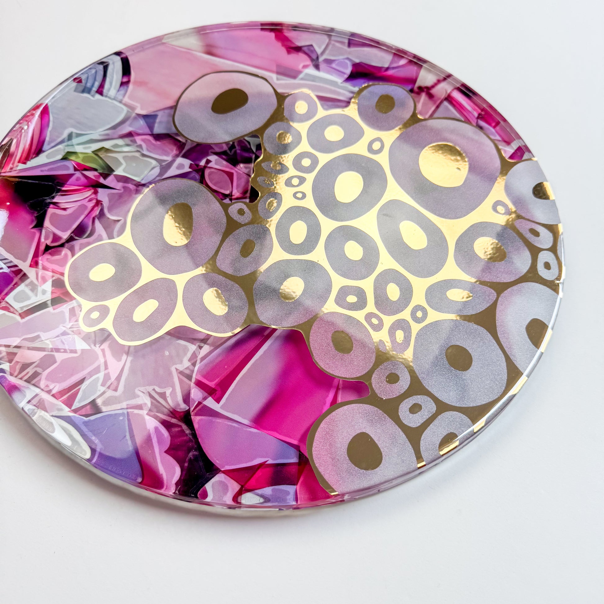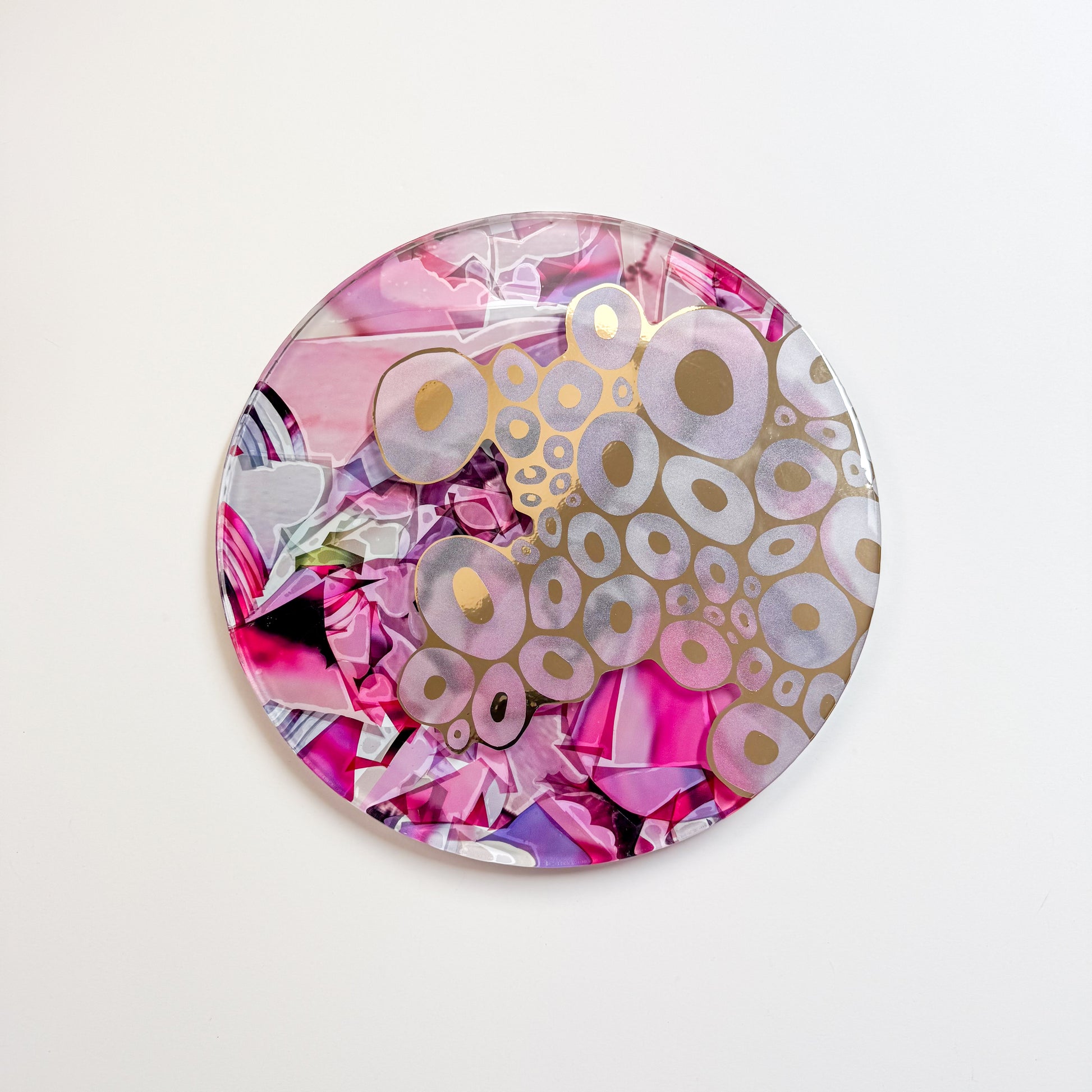 13"d - A circular clear plexiglass panel layered with a cut-out gold and frosted vinyl, set against a collage of printed of a watercolour paintings on the reverse. The surface is sealed in glossy resin, creating depth and an interplay of light within the composition. Ready to hang with D-rings affixed to the back.